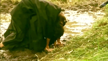 ↑ 因上士要求讓路,而退到田地的龍馬,身上背著朋友武市,仍要跪拜。好艱難的動作!